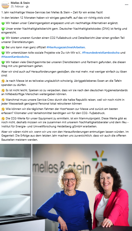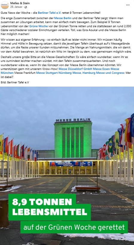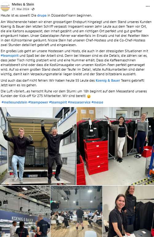 Seit Anfang 2024 betreut Kontx den LinkedIn– und den Facebook-Account von Melles & Stein. Hier berichtet das Unternehmen über Nachhaltigkeitsthemen, gewährt einen Blick hinter die Kulissen eines Messedienstleisters, bezieht Stellung zu gesellschaftlichen Themen, lässt das Team zu Wort kommen und feiert gemeinsam erreichte Meilensteine. Und auch Herausforderungen auf dem Weg zu mehr Nachhaltigkeit werden hier von Melles & Stein transparent thematisiert.