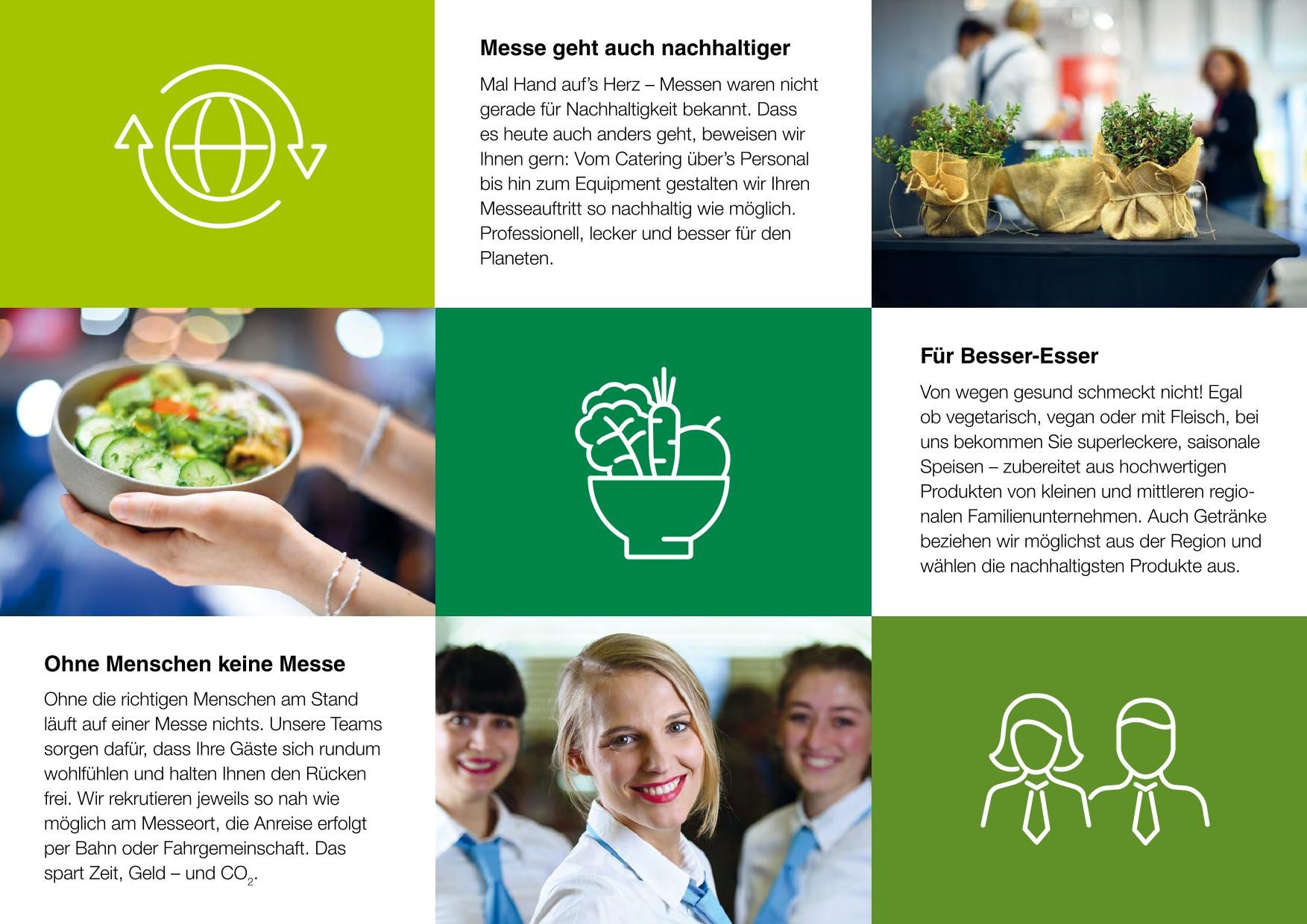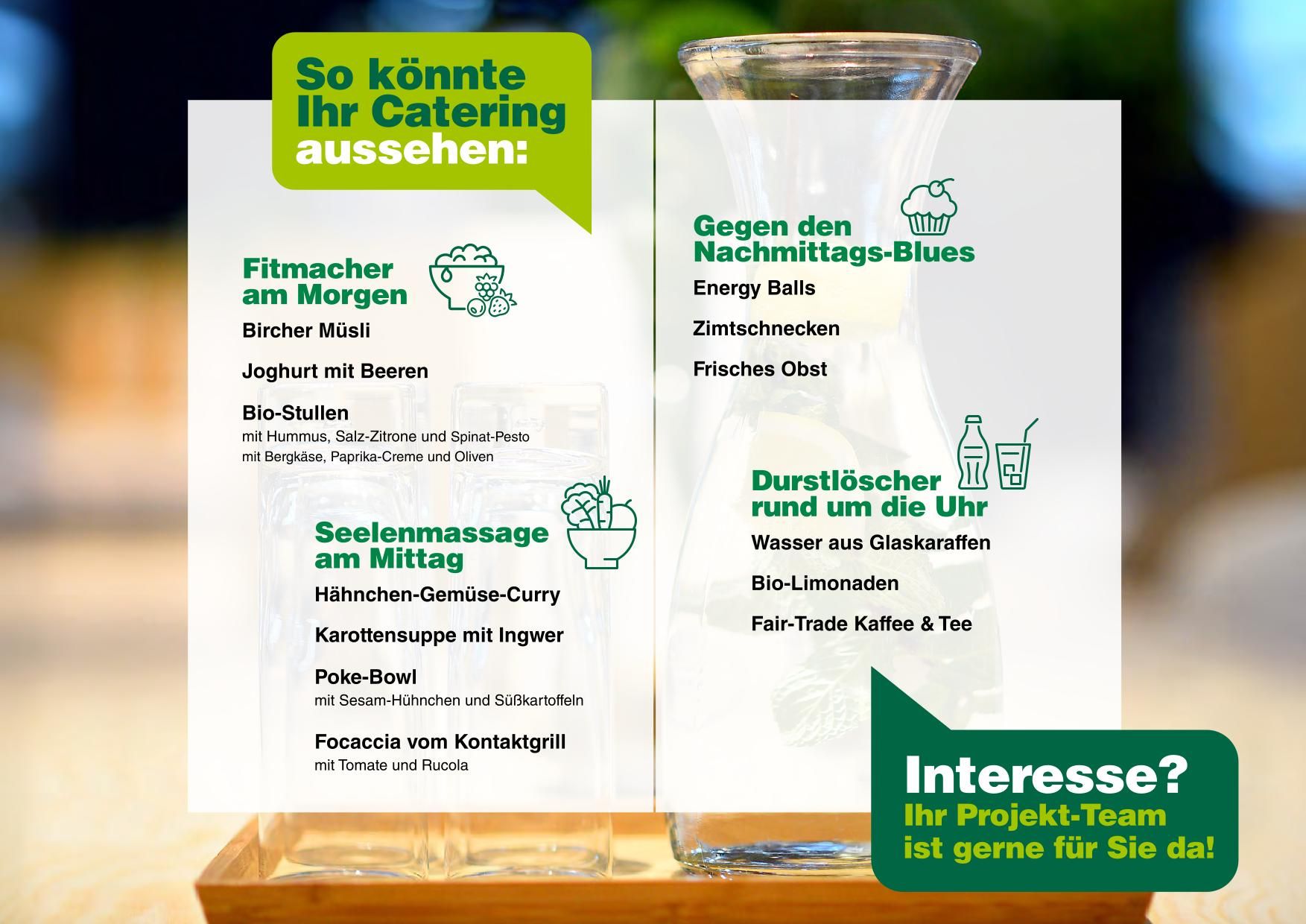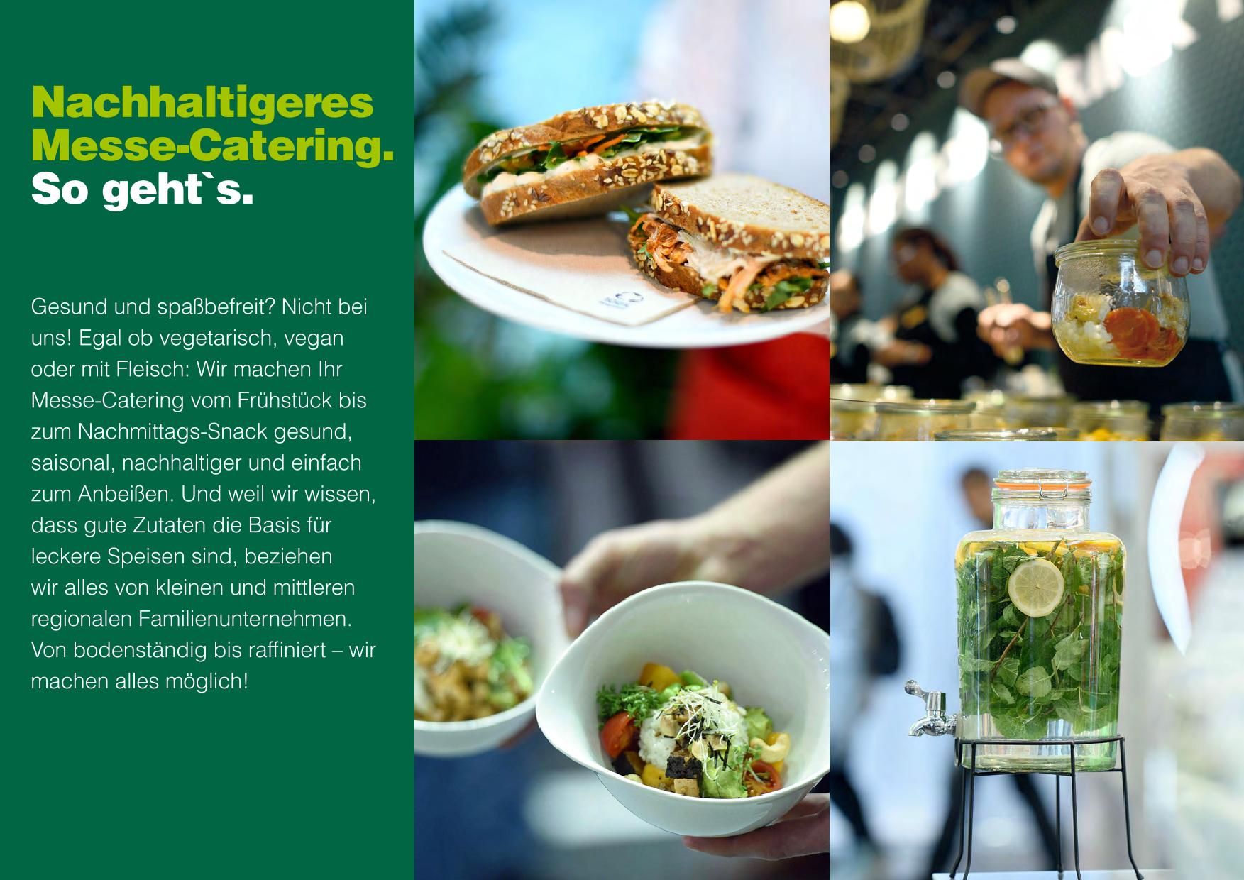 Und um auch die eher skeptischen Kunden vom nachhaltigen Catering zu überzeugen, gibt es einen Flyer, der exemplarisch aufzeigt, wie so ein nachhaltiges Catering aussehen könnte. Nämlich lecker, gesund, attraktiv und kein bisschen spassbefreit.