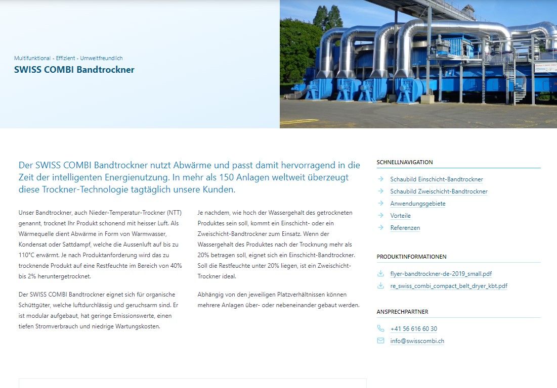 2023 wurde die Seite noch um einen «Aktuelles»-Bereich erweitert, um dort Neuigkeiten aus dem Unternehmen aber auch ergänzenden Informationen oder neue Use Cases für die Trocknungslösungen von SWISS COMBI vorstellen zu können. Während bei den Unterseiten zu den einzelnen Trocknungslösungen der Fokus eher auf technischen Details liegt, bietet «Aktuelles» die Möglichkeit, die Lösungen und das Unternehmen SWISS COMBI dank Storytelling erlebbar zu machen.