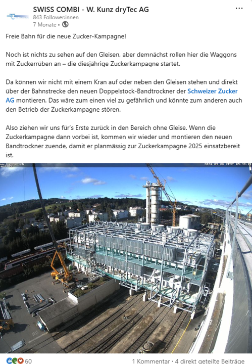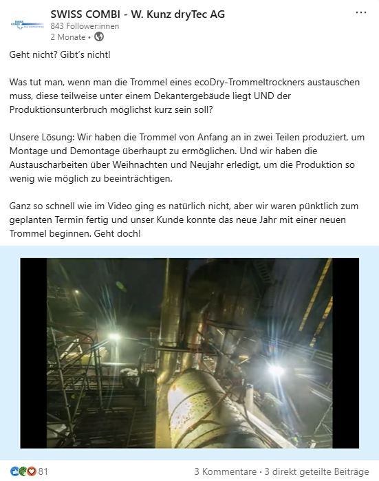Innovationen von SWISS COMBI, clevere Lösungen für ungewöhnliche Herausforderungen sowie verschiedene Use Cases für die unterschiedlichen Trocknungslösungen des Unternehmens stehen hier im Vordergrund. Um SWISS COMBI ausserdem als attraktiven Arbeitgeber zu positionieren, wird LinkedIn auch für News aus dem Team, Firmenjubiläen oder gemeinsame Aktivitäten genutzt.